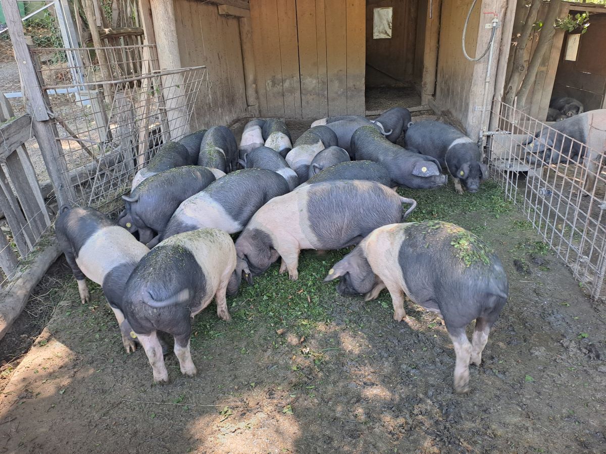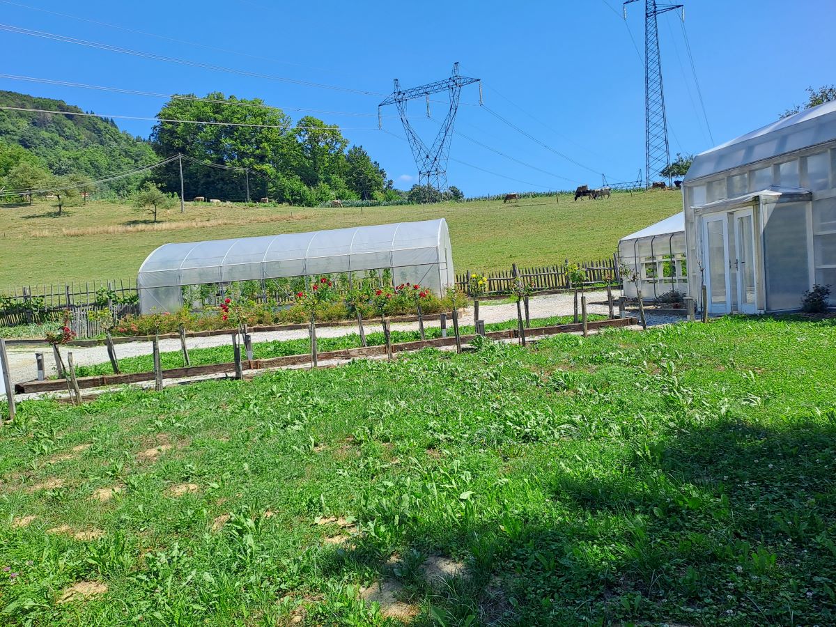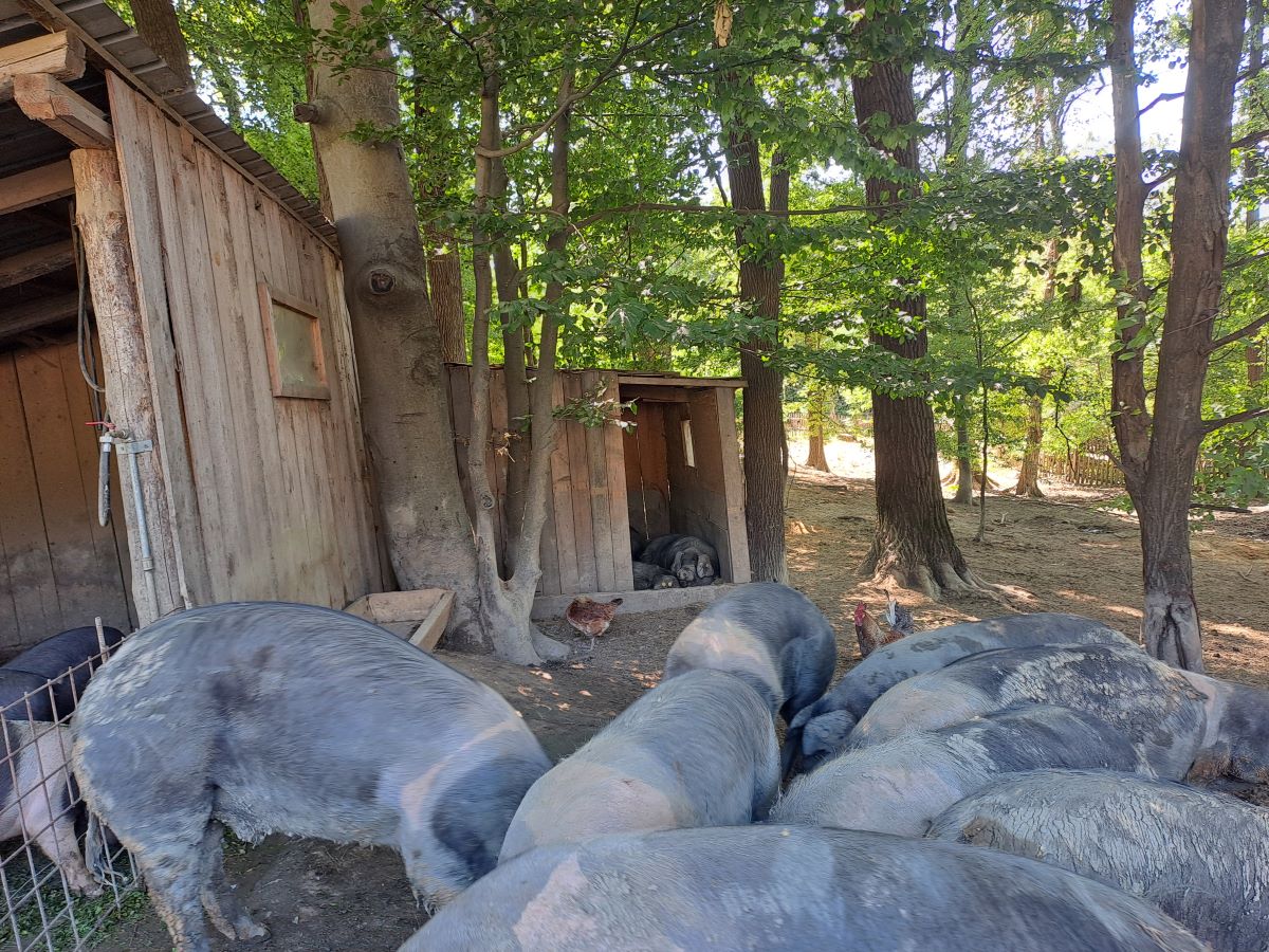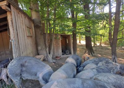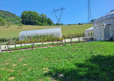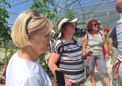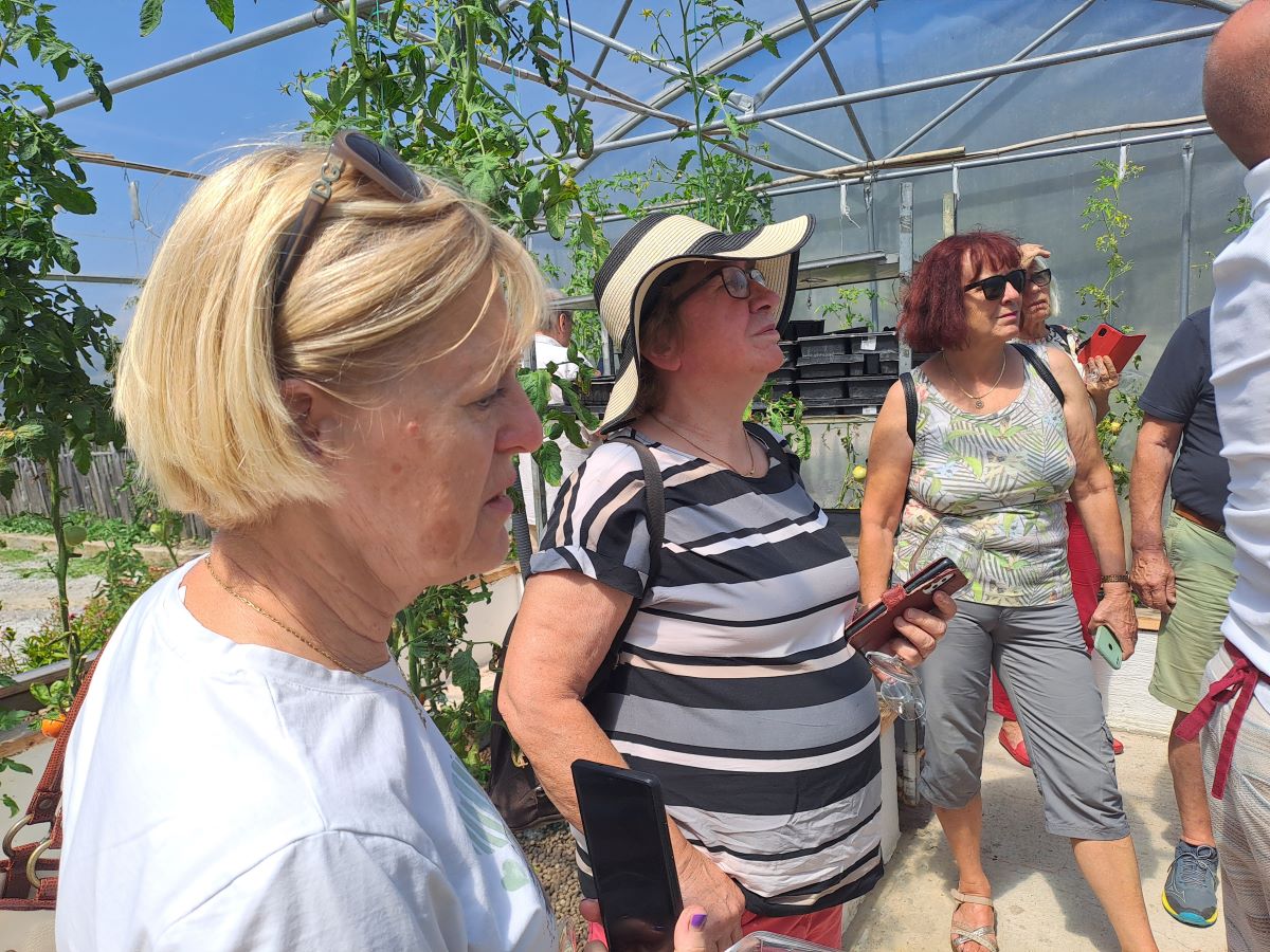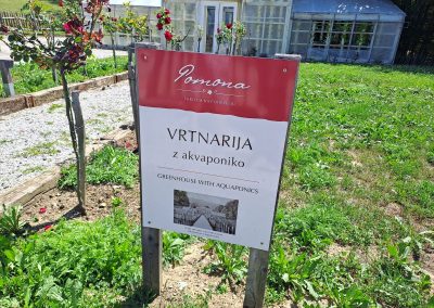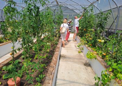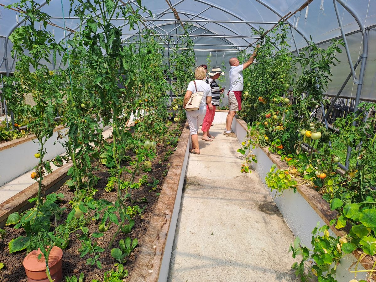Nimajo pa samo prašičev, naš naslednji ogled je veljal dvema rastlinjakoma z akvaponiko. Tu gojijo ribe. V prvem rastlinjaku se z vodo iz ribnikov napajajo police s solato, ki tu zelo lepo uspeva. Drugi rastlinjak pa je namenjen vzgoji paradižnikov, paprik, jajčevcev, začimbnih rastlin. Tudi ta se napaja z vodo iz ribnika. Poleg rastlinjakov se nam je odprl razgled na velik sadovnjak z jabolki in hruškami. Žal letos ne bo pridelka, pozeba je terjala svoj davek.