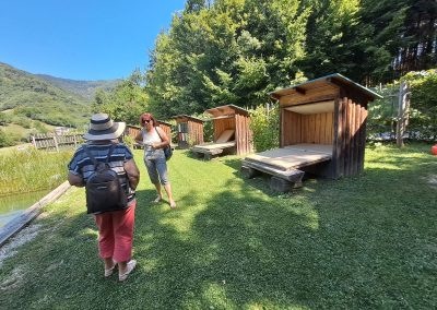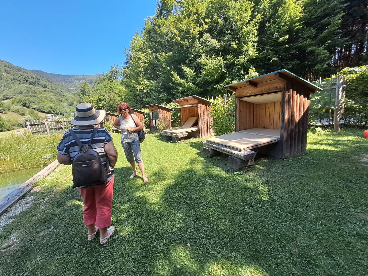 Pot nas je vodila najprej mimo stavbe z apartmaji, do bazena, kjer se voda prečiščuje po naravni poti, s primernimi rastlinami nasajenimi ob robu. Gosti lahko plavajo in se sproščajo v hiškah, ki so kot čebelnjaki.