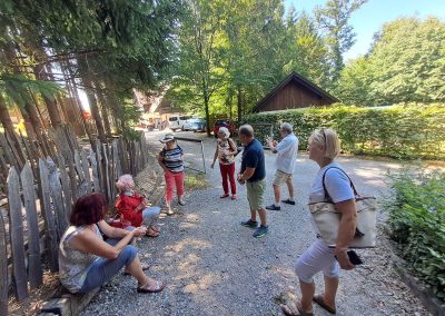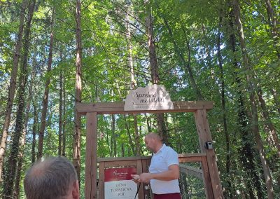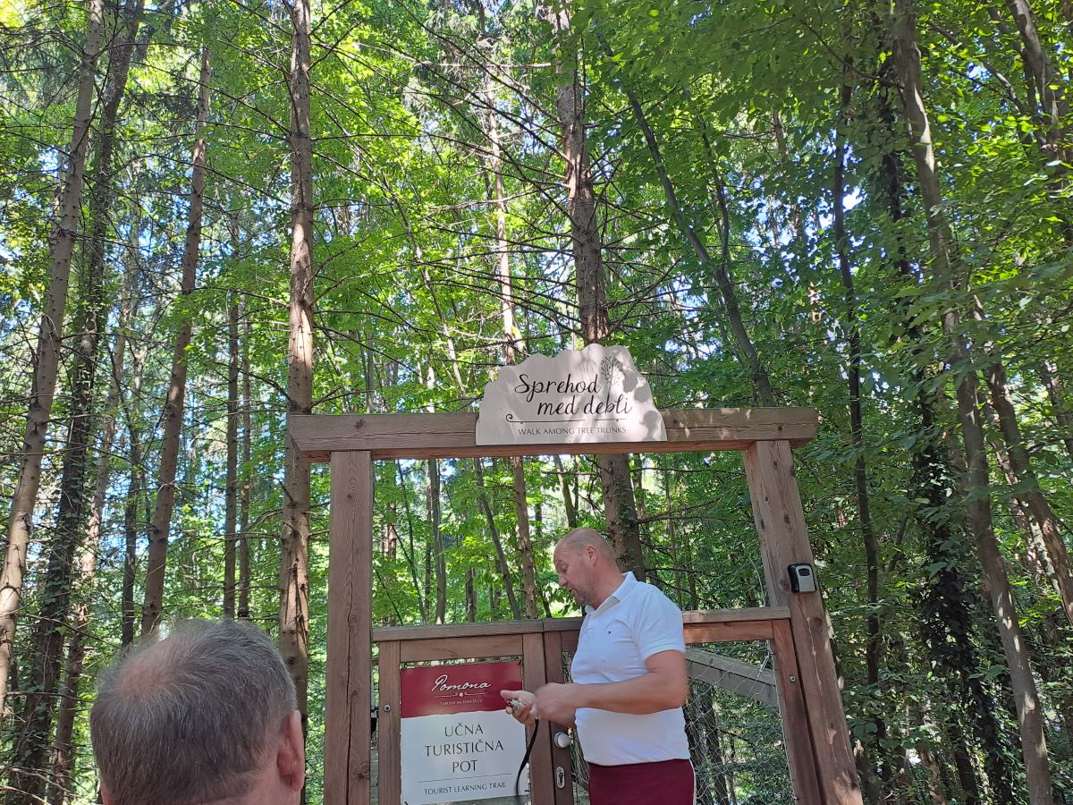 Nadaljevali smo po leseni poti med krošnjami dreves, visoko nad tlemi. Pot so zgradili tako, da niso podirali dreves ampak so »vijugali« med njimi. S te poti smo videli nasad, kjer gojijo gobe šitake. Sledila je ograda s krškopoljskimi prašiči, ki smo jih lahko hranili s pripravljeno hrano. Kar lepa čreda se jih je svobodno gibala po gozdu. Meso teh prašičev je tudi del turistične ponudbe.